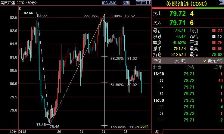 北京时间16:59,NYMEX原油期货下跌0.56%至79.68美元/桶;ICE布伦特原油期货下跌0.51%至85.80美元/桶。