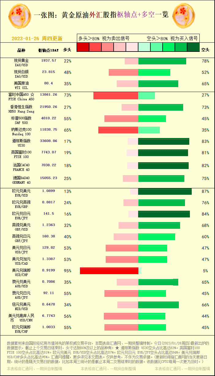一张图:黄金原油外汇股指"枢纽点+多空占比"一览(2023/01/26周四)