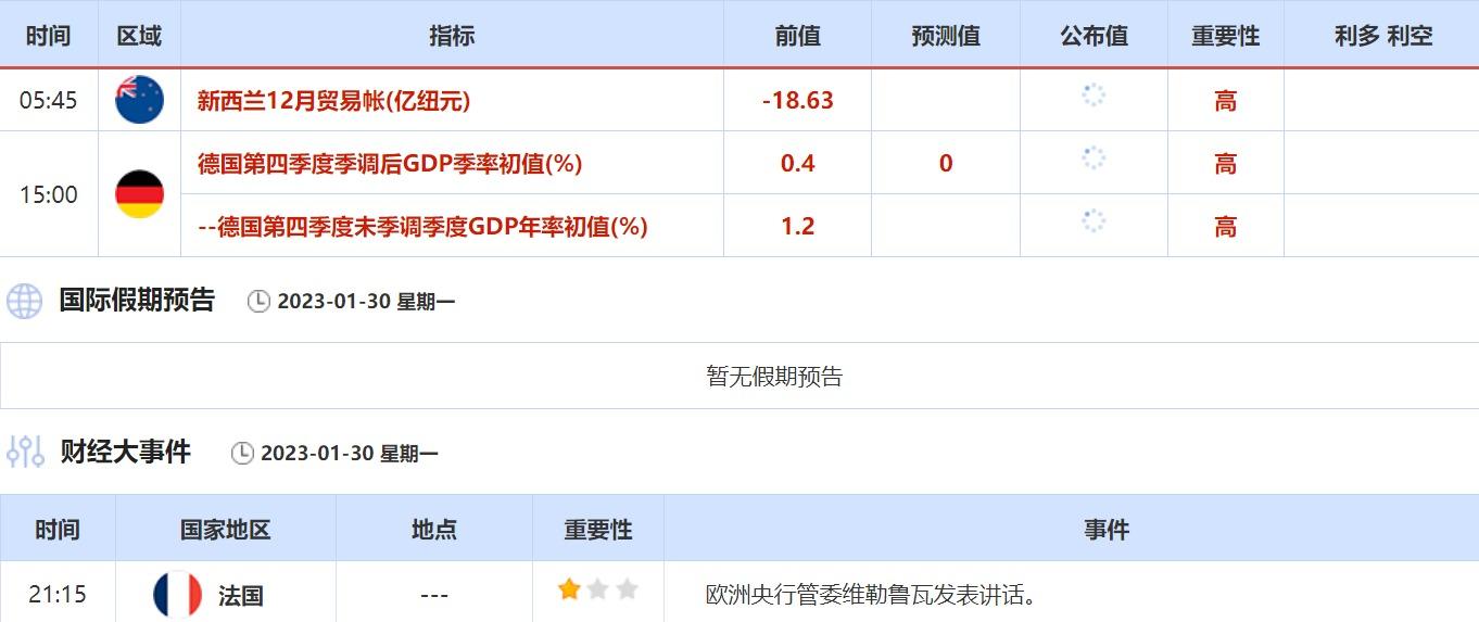 ①1月30日(周一)关键字:德国第四季度GDP,欧洲央行管委维勒鲁瓦