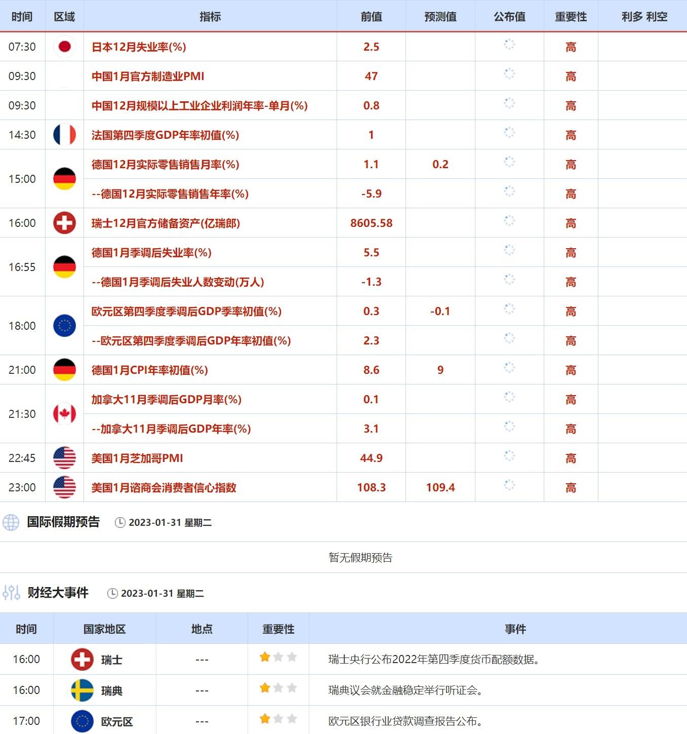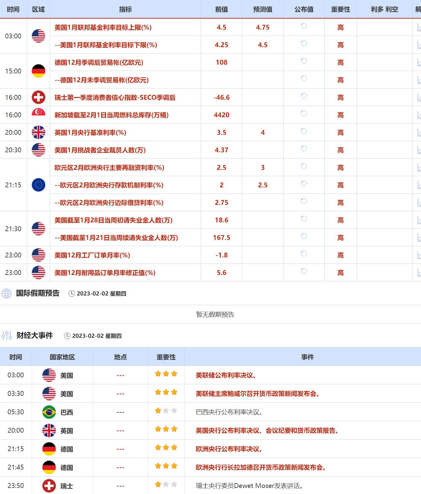 2月2日,投资者需关注美联储、英国央行和欧洲央行利率决议。目前市场预期当天美联储加息25个基点,英国央行加息50个基点,欧洲央行加息50个基点。此外,投资者需关注美联储主席鲍威尔和欧洲央行行长拉加德召开的新闻发布会。