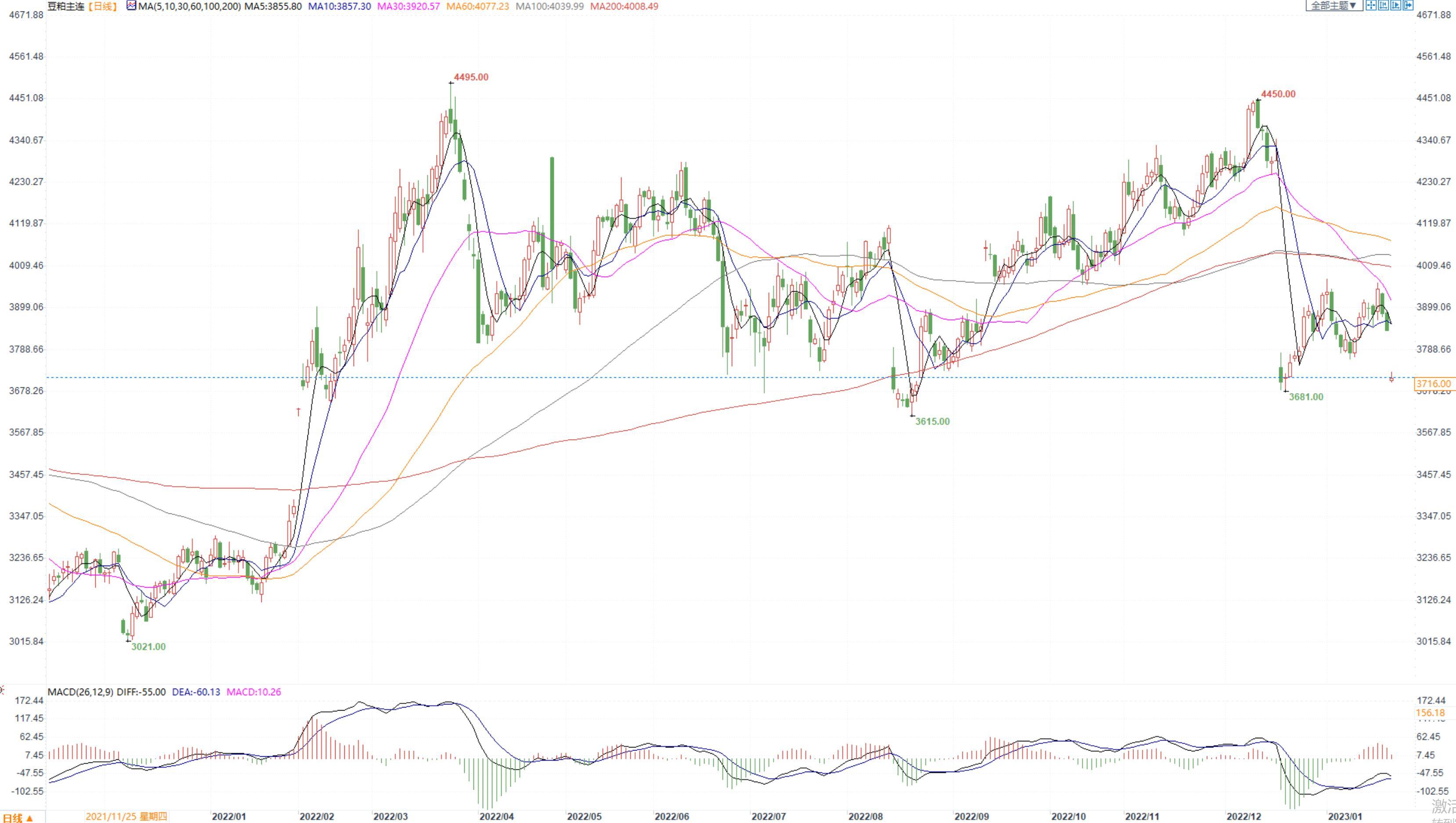 豆粕2305合约日内涨1.04%,收盘价3899元/吨,现货张家港43%蛋白豆粕4570元/吨