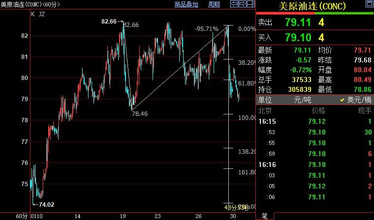北京时间16:18,NYMEX原油期货下跌0.78%至79.06美元/桶;ICE布伦特原油期货下跌0.66%至85.83美元/桶。