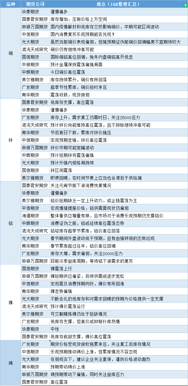 期货公司观点汇总一张图:1月31日有色系(铜、锌、铝、镍、锡等)