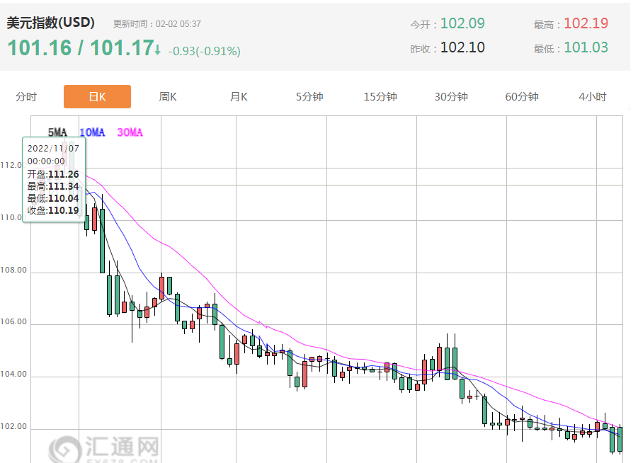 汇通财经APP讯——2月2日(周四),美元周三扩大跌幅,兑一篮子货币跌至九个月低点,此前美联储主席鲍威尔谈到在降低通胀压力方面取得进展,但美联储仍警告将进一步收紧货币政策。油价收低,盘中一度下跌超过3美元,此前美国政府数据显示,原油、汽油和馏分油库存均大增,同时OPEC+维持产量政策不变。
