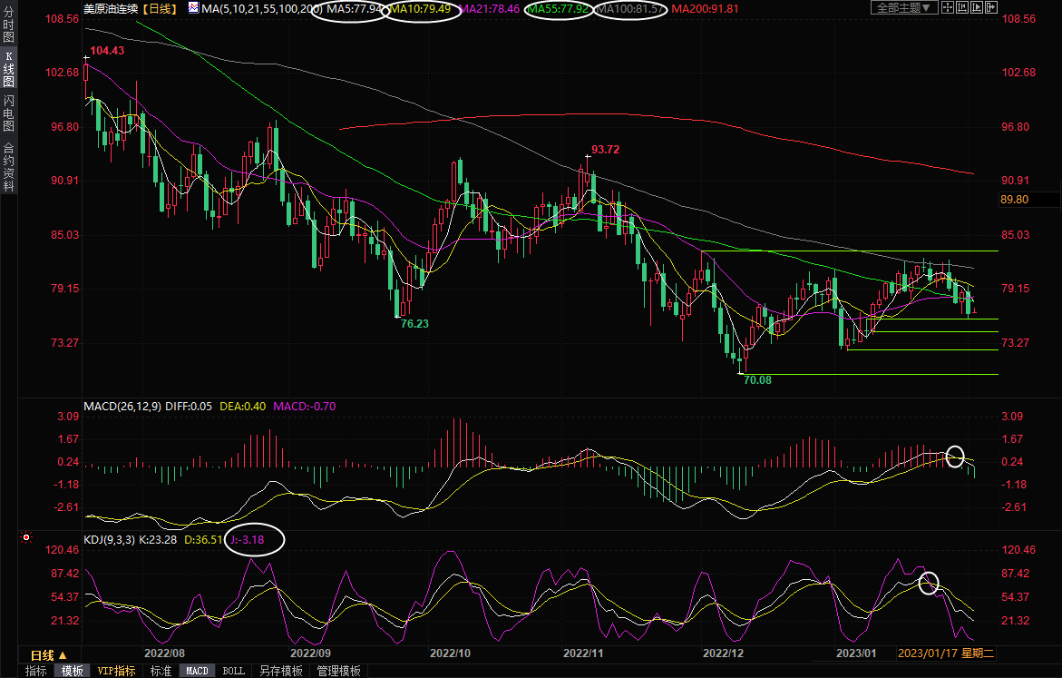 短线的话,1月10日低点75.91附近还存在一些支撑,隔夜低点支撑也在该位置附近,1月11日低点支撑在74.28附近,1月5日低点支撑在72.44附近。