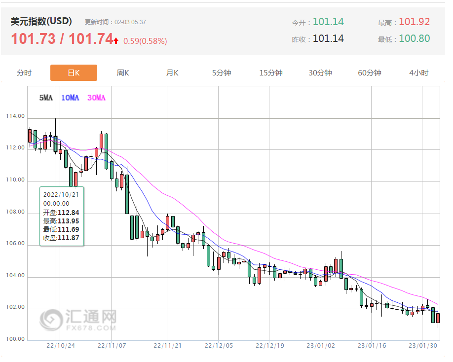 汇通财经APP讯——2月3日(周五),美元兑一篮子货币周四上涨0.74%,至101.71;欧元兑美元下跌,此前欧洲央行一如预期将利率提高了50个基点,而英国央行对通胀采取了更加鸽派的基调;金价下跌近2%,因美联储主席鲍威尔的鸽派发言而攀升至九个月高位后,一些投资者获利了结。