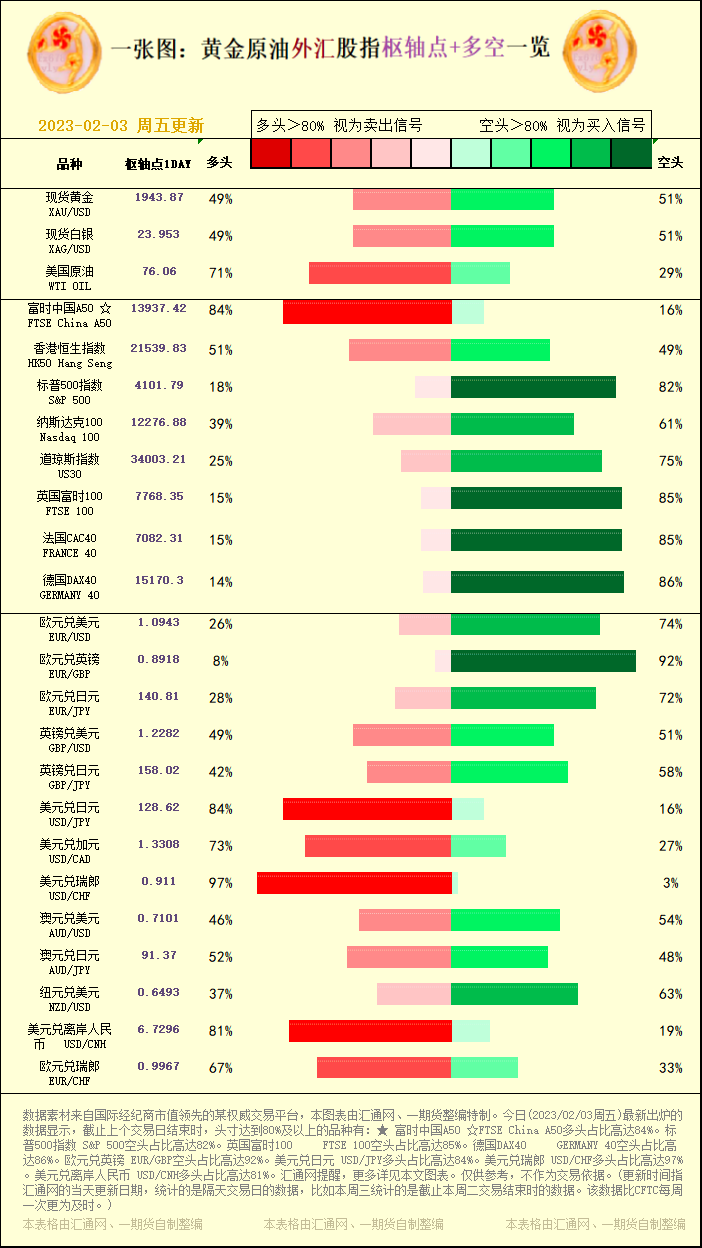 一张图:黄金原油外汇股指"枢纽点+多空占比"一览(2023/02/03周五)
