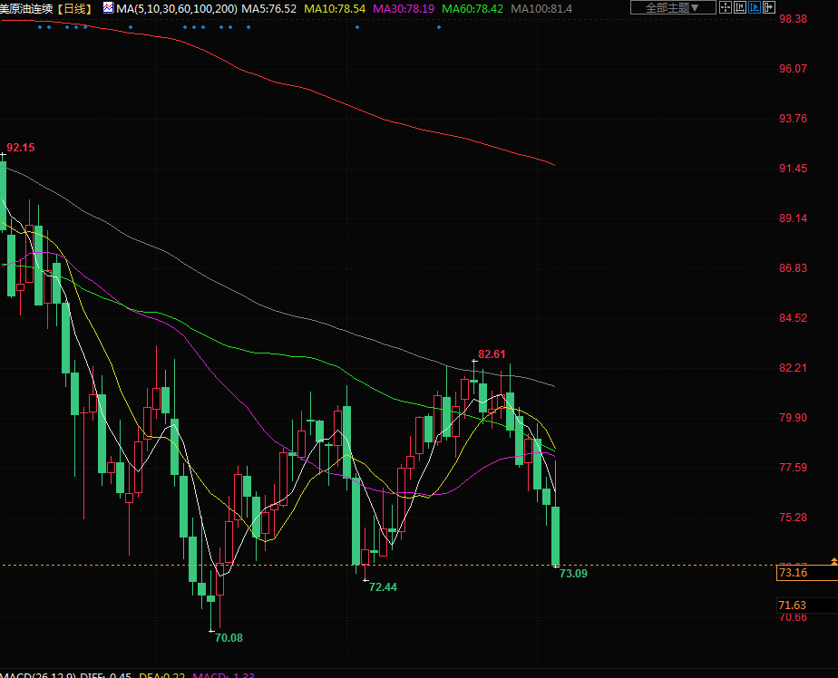 商品收盘情况:布伦特原油期货下跌2.7%,报每桶79.94美元,稍早一度高见84.20美元,日低79.72美元的1月11日以来最低。美国原油期货收跌3.3%,报73.39美元,盘中在73.13-78.00之间交投,前者为1月5日以来的最低水平。美国期金结算价下跌2.8%至1876.6美元。
