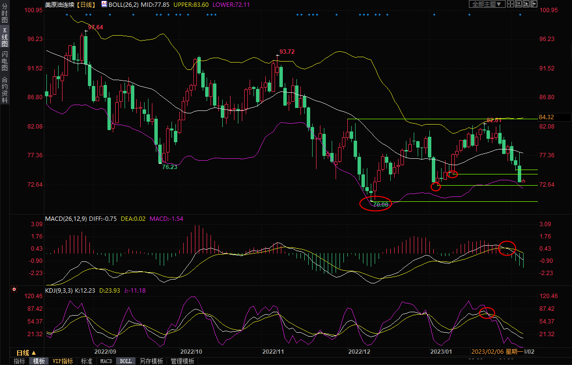 日线级别:震荡;MACD死叉,KDJ死叉,油价从布林线上轨附近受阻后持续走弱,目前跌至布林线下轨附近,上一交易日录得带上影线中阴线,暗示布林线中轨上方卖压较强,后市短线仍偏向空头,布林线下轨轻微开口,留意1月5日低点72.44附近支撑,如果失守该位置,则料将进一步下探70整数关口附近支撑,12月9日低点支撑也在该位置附近,如果进一步下破,则增加中线看空信号;中线目标有望看向2021年12月2日低点62.43附近。