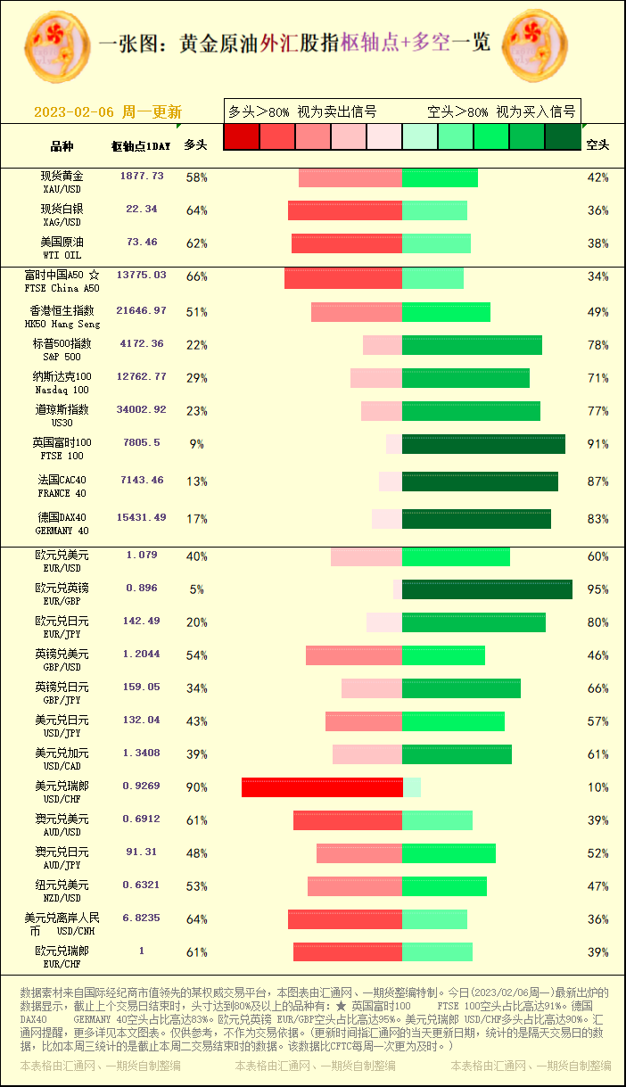 一张图:黄金原油外汇股指"枢纽点+多空占比"一览(2023/02/06周一)
