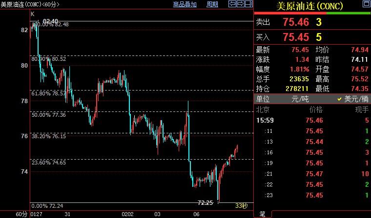 北京时间16:00,NYMEX原油期货上涨1.75%至75.41美元/桶;ICE布伦特原油期货上涨1.67%至82.34美元/桶。