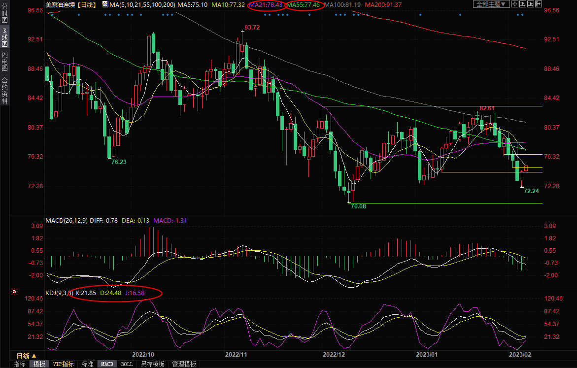 日线级别:震荡下跌后反弹;MACD死叉,KDJ死叉后在接近超卖区域初步拐头有金叉趋势,油价隔夜在1月5日低点72.44和布林线下轨两道支撑附近获得支撑后收涨,局部K线接近“斩回线”底部信号,油价短线存在转多的机会。目前初步顶破了2月2日低点74.95附近阻力,进一步阻力在1月31日低点76.54附近,关键阻力在55日均线和10日均线的双重阻力位77.46附近,若能收复该位置,则增加短线看涨信号;21日均线阻力在78.44附近,然后是80整数关口阻力。