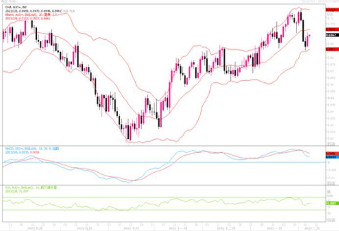 澳元周二(2月7日)波动很大,兑美元涨幅一度达到1.15%,至0.6959美元的日内高点。澳洲央行稍早升息25个基点,并重申将可能需要进一步升息--比许多人的预期更为鹰派。澳洲央行这种表态说明,其认为通胀将在较长一段时间内保持高位,打压了今年晚些时候或明年初放松货币政策的看法。4小时图上,澳元兑美元在0.6850附近得到较强的支撑,MACD出现金叉,显见短线或会产生较强的反弹。上方初步阻力在0.70,破位后有望向0.7100冲击。而下方若跌破0.6850,将威胁0.68至0.6725区域的支撑。