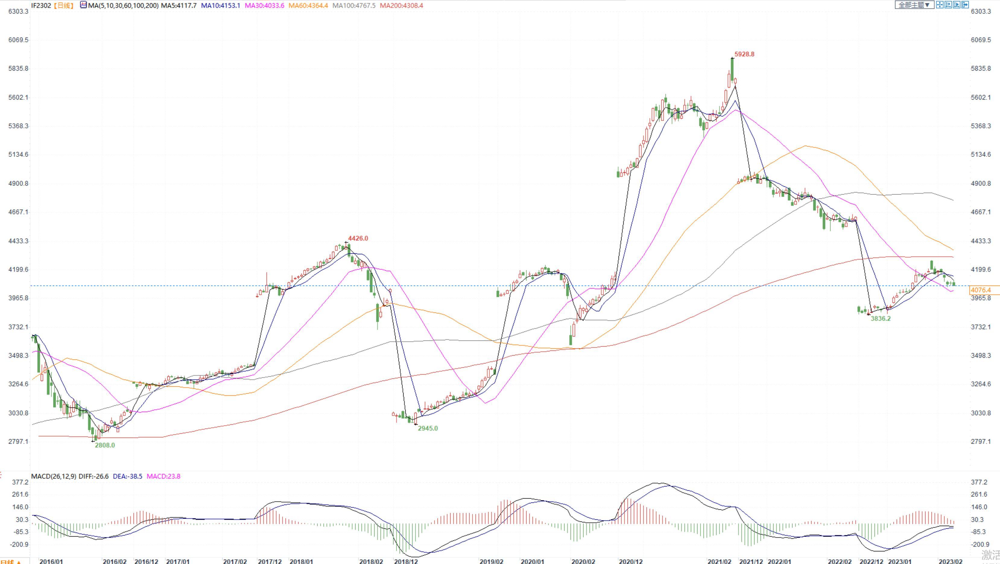 【今日涨跌】四大期指全线收跌。IH2302收盘价为2734.0,收跌0.29%;IF2302收盘价为4076.4,收跌0.36%;IC2302收盘价为6266.0,收跌0.62%;IM2302收盘价为6865.8,收跌0.42%。