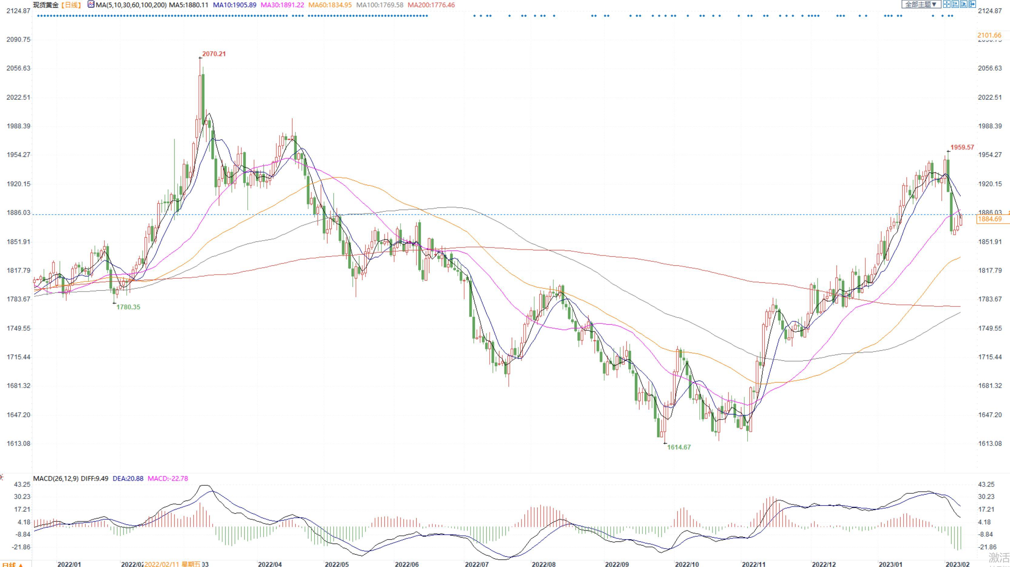 【今日行情】金银全线收跌。AU2304收盘价为412.70,收跌0.06%;AG2306收盘价为4993,收跌0.30%。隔夜美元指数小幅收跌,但未跌破103整数关口,十年期美债收益率在3.6%附近窄幅震荡。