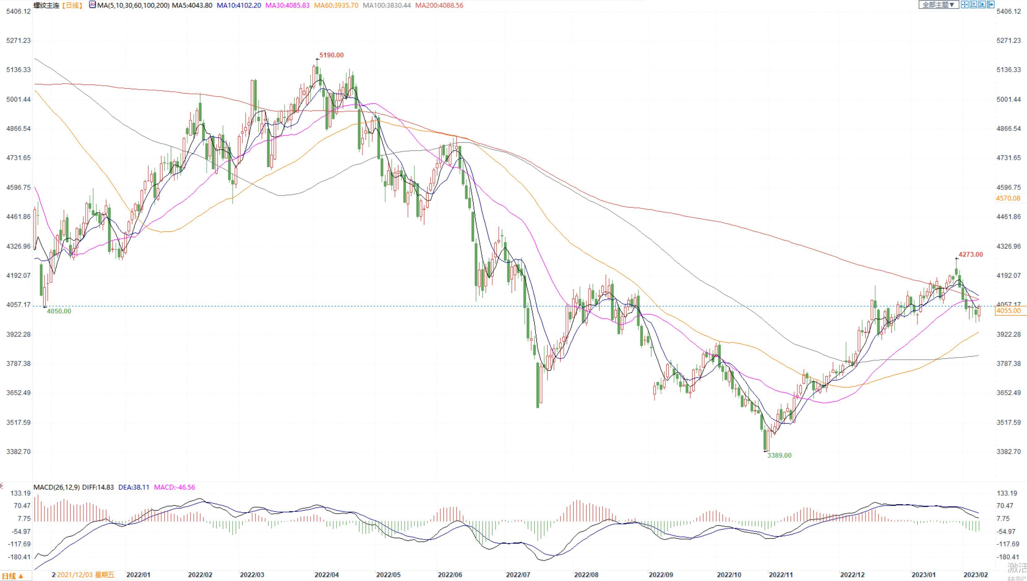 价格:今日,黑色系各品种出现回升,原料端涨幅居前。在原料端提振下,螺纹钢2305合约白天震荡上行,收盘价4055元/吨。较昨结上涨39点,收涨0.97%。上海中天现货价4110元/吨,较昨日继续下降10元/吨。