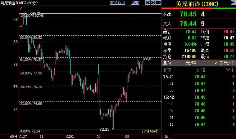 北京时间15:43,NYMEX原油期货下跌0.03%至78.45美元/桶;ICE布伦特原油期货上浮0.05%至85.13美元/桶。