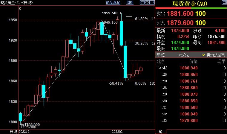北京时间14:45,现货黄金上涨0.30%至1881.00美元/盎司;COMEX期金主力合约上浮0.11%至1892.8美元/盎司;美元指数下跌0.23%至103.245。