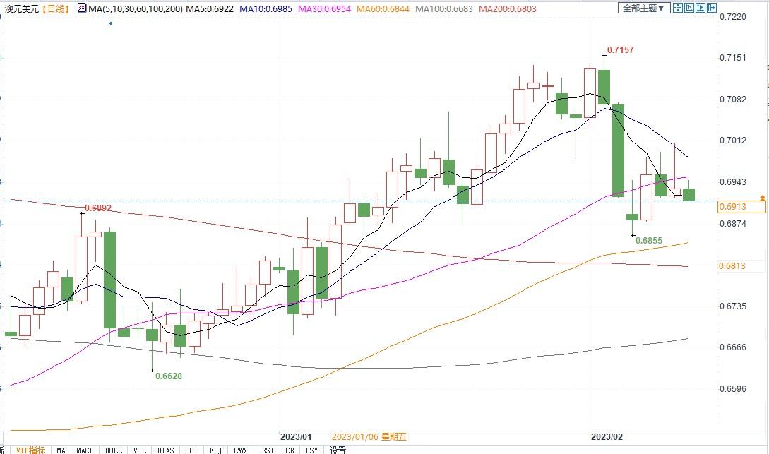 北京时间2月10日11:47,澳元兑美元报0.6913/14
