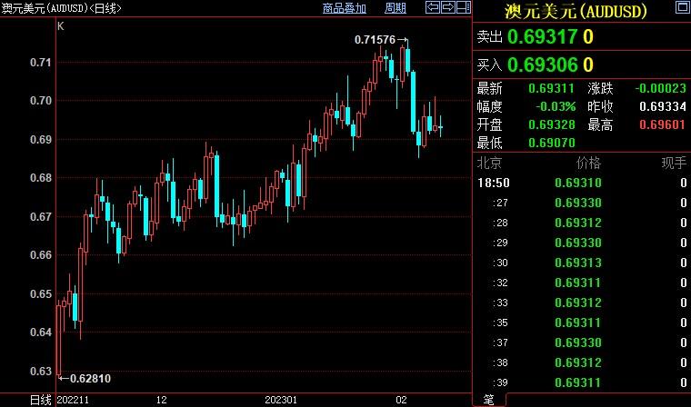 澳元兑美元周初创1月6日以来新低至0.6855,但随着澳洲联储不断发出鹰派论调,本周市场定价发生巨大变化,对澳洲利率的峰值预期从此前的3.60%飙升至4.1%,澳元兑美元低位反弹,目前小幅上涨逾0.1%。