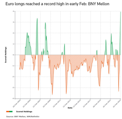 纽约梅隆银行的iFlow仓位数据显示,其客户持有的欧元兑所有其他货币的多头头寸(即押注欧元上涨的头寸)几乎是过去20年平均水平的四倍,创下纪录高位。