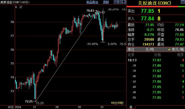 北京时间16:14,NYMEX原油期货下跌0.27%至77.85美元/桶;ICE布伦特原油期货下跌0.12%至84.40美元/桶。