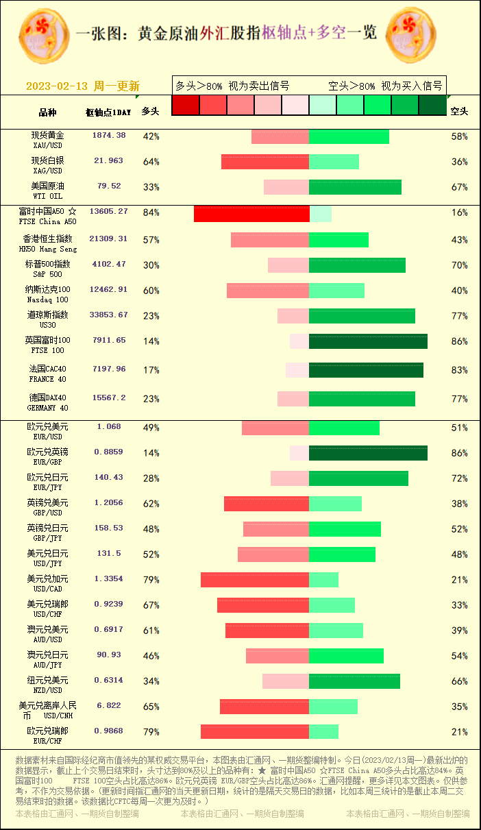 一张图:黄金原油外汇股指"枢纽点+多空占比"一览(2023/02/13周一)