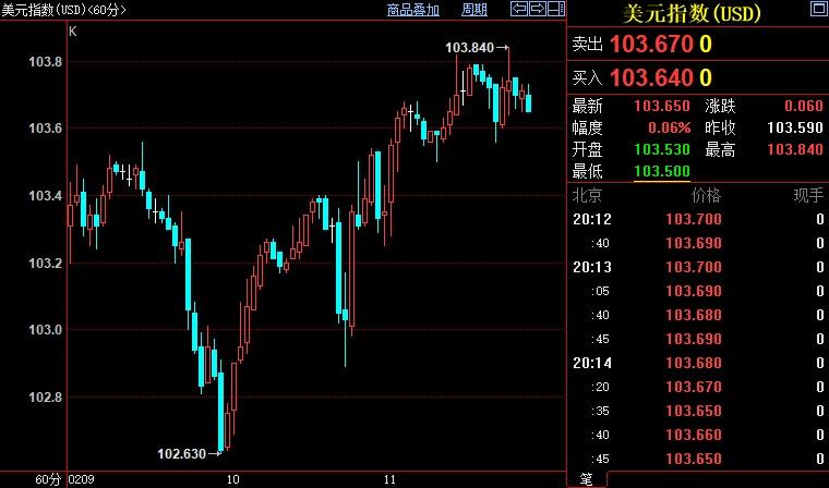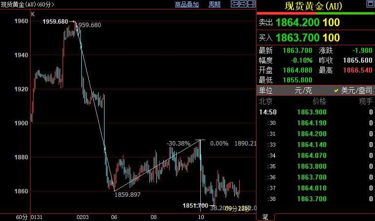 北京时间20:15,现货黄金下跌0.23%至1860.76美元/盎司;COMEX期金主力合约下跌0.15%至1871.7美元/盎司;美元指数上浮0.08%至103.655。