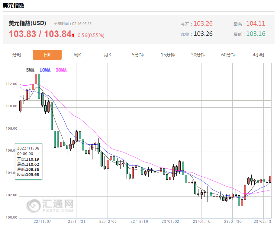 他补充说,“我们现在不仅更新了利率预期,预计3月份加息25(个基点),然后在5月份再加息25个基点,而且还有可能利率必须保持在高位更长时间。那么,高位在哪里?每过一天,美联储2%的(通胀)目标就显得更远一些,”在下午的交易中,美元指数上涨0.6%,至103.90,此前曾触及104.11的六周峰值。