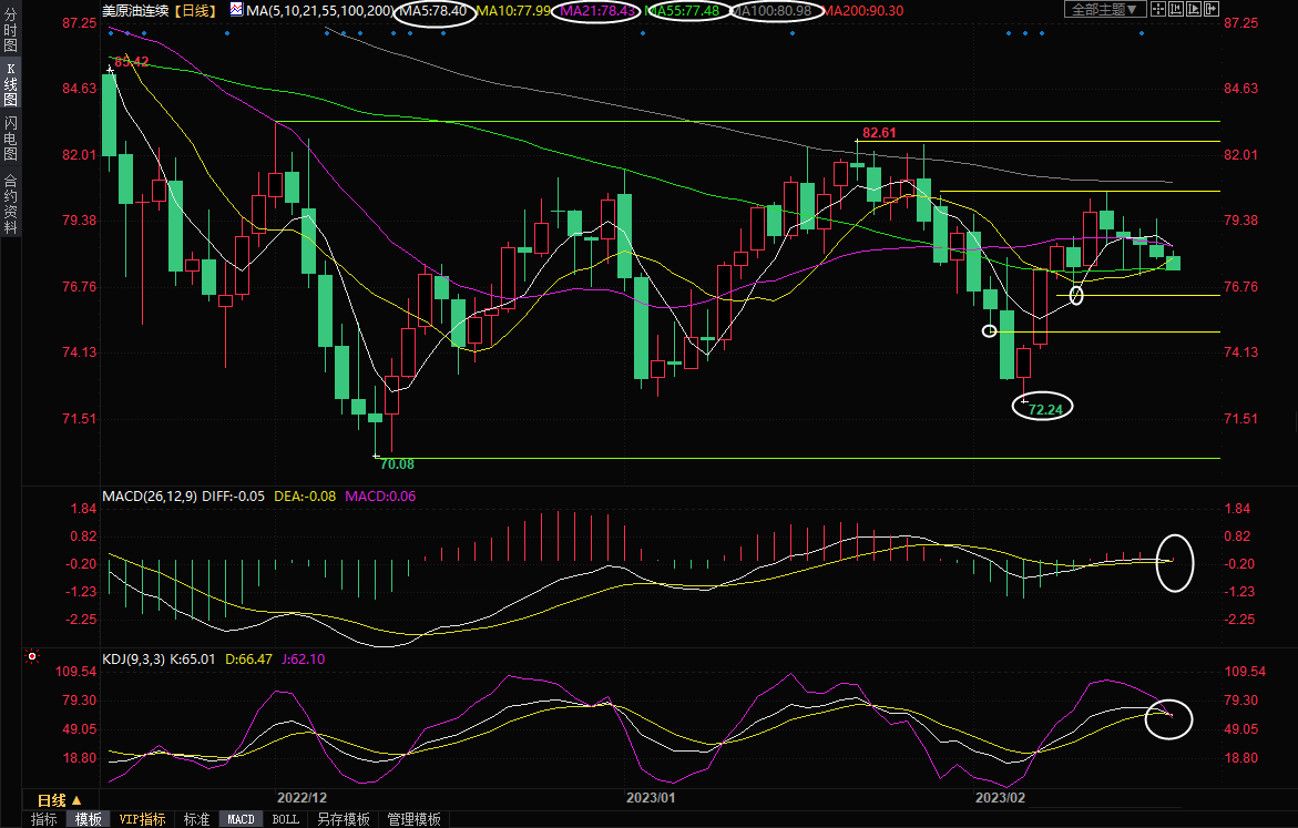 失守55日均线前,多头也还留有一点点的机会,上方21日均线阻力在78.43附近,5日均线阻力也在该位置附近,若能收复该位置,则削弱短线看空信号,隔夜高点阻力在79.52附近,100日均线阻力在80.98附近。