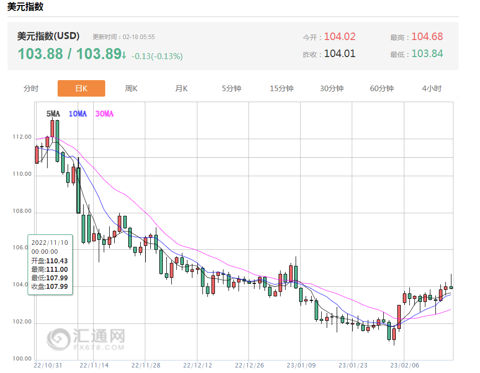 联邦基金利率期货交易员现认为,利率将在7月达到5.29%的峰值,并在全年保持在5%以上。美联储目前的指标利率目标区间为4.5%-4.75%,从2022年3月时的0%-0.25%迅速提高。 美元指数盘尾下跌0.24%,报103.83,稍早曾触及104.67的1月6日以来最高。