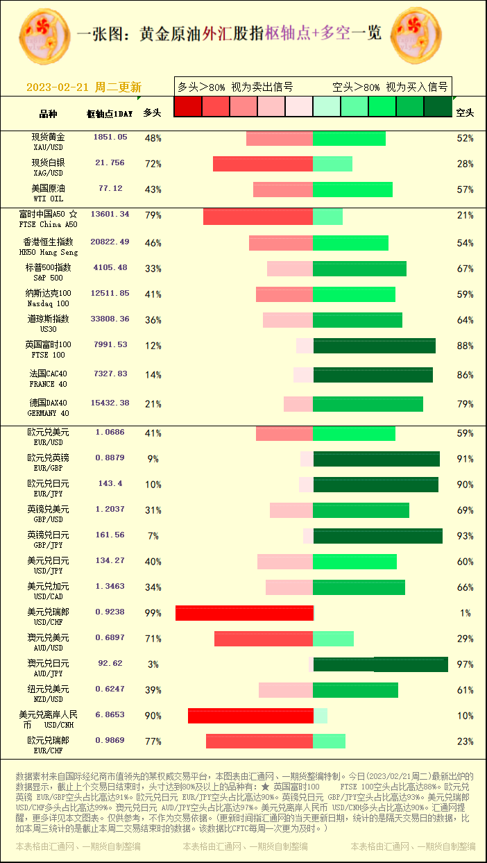 一张图:黄金原油外汇股指"枢纽点+多空占比"一览(2023/02/21周二)