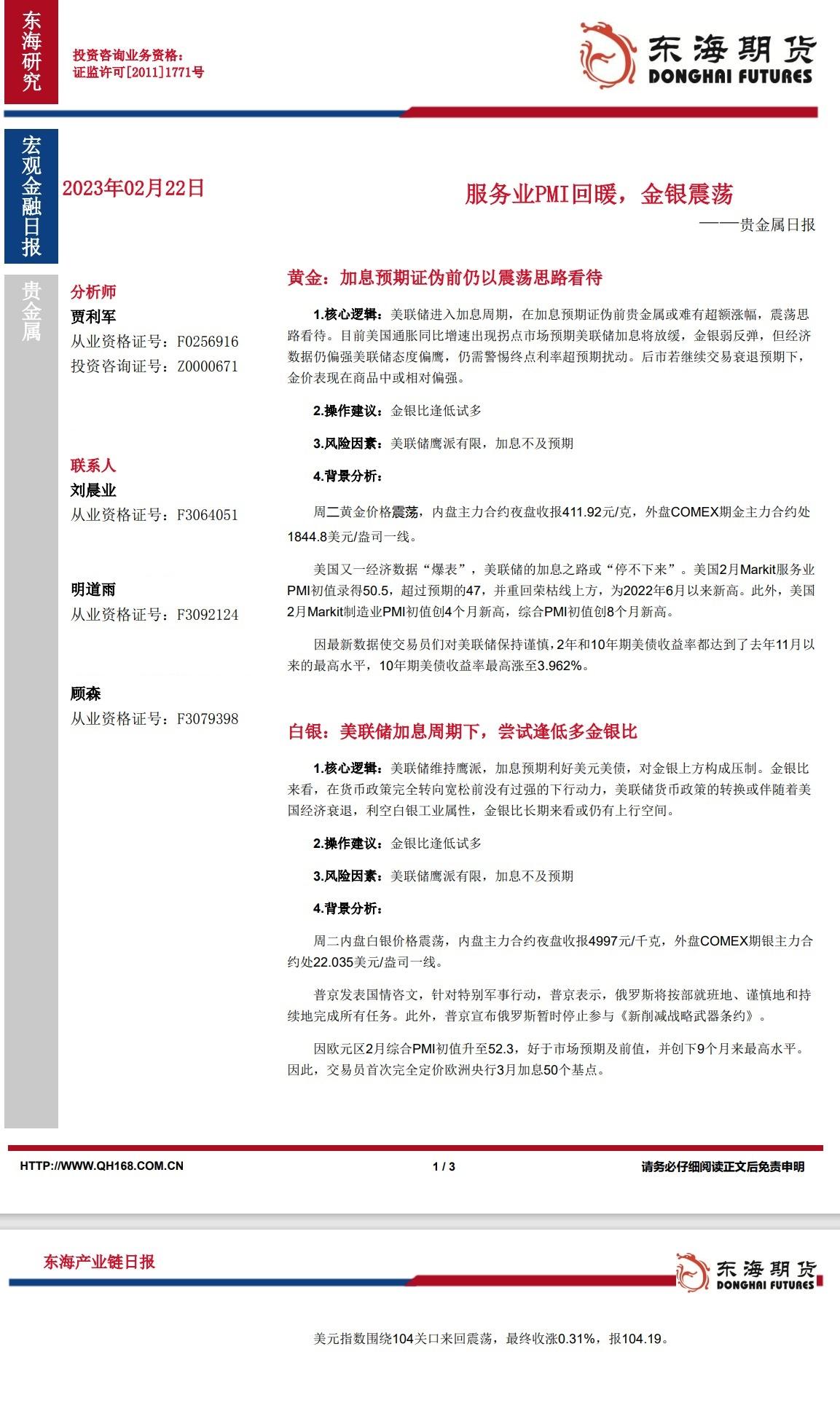 【东海期货2月22日产业链日报】贵金属篇:服务业PMI回暖,金银震荡